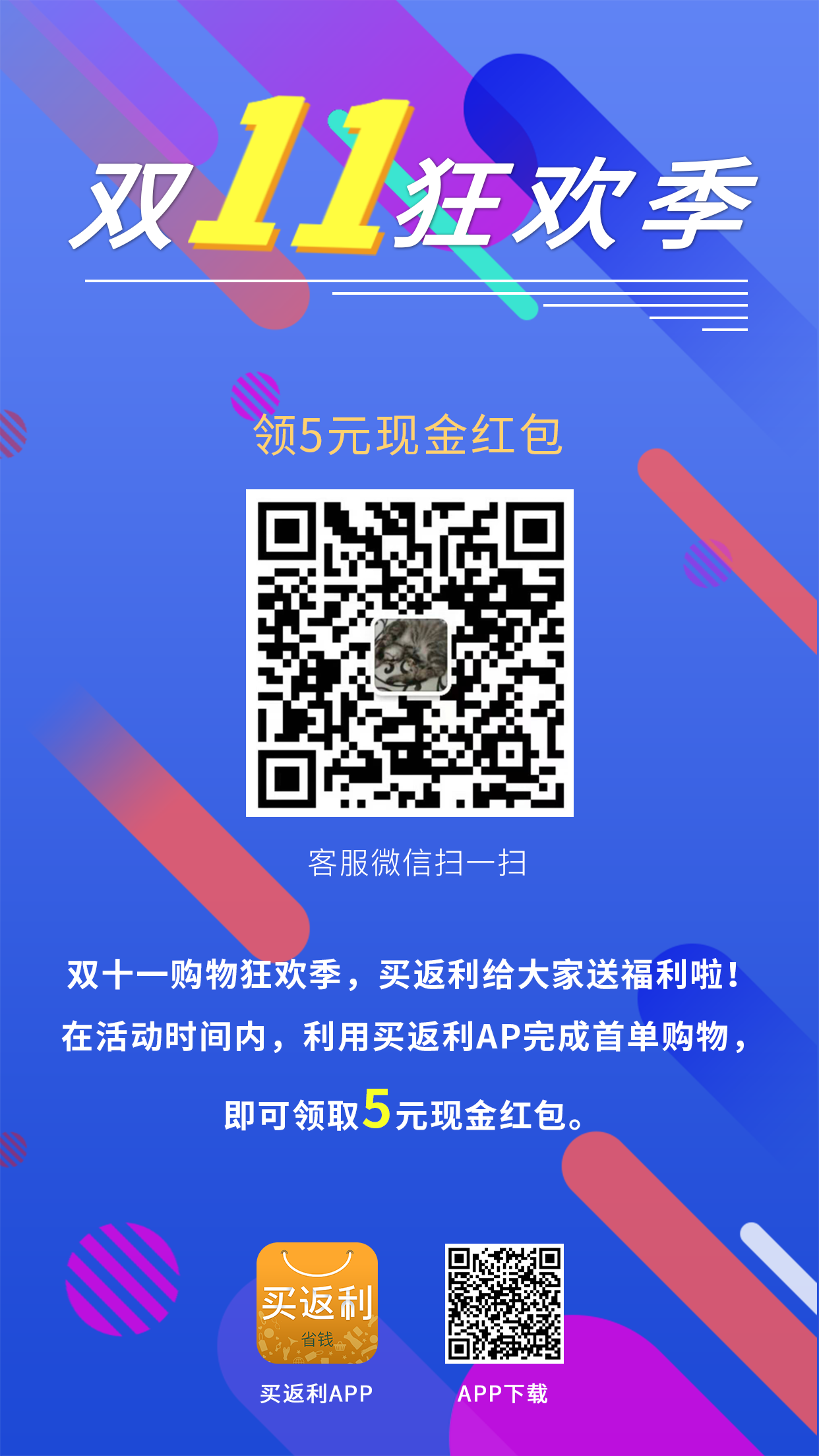 活动内容:双十一购物狂欢季,买返利给大家送福利啦!在活动时间内,利用买返利APP完成首单购物,即可领取5元现金红包。